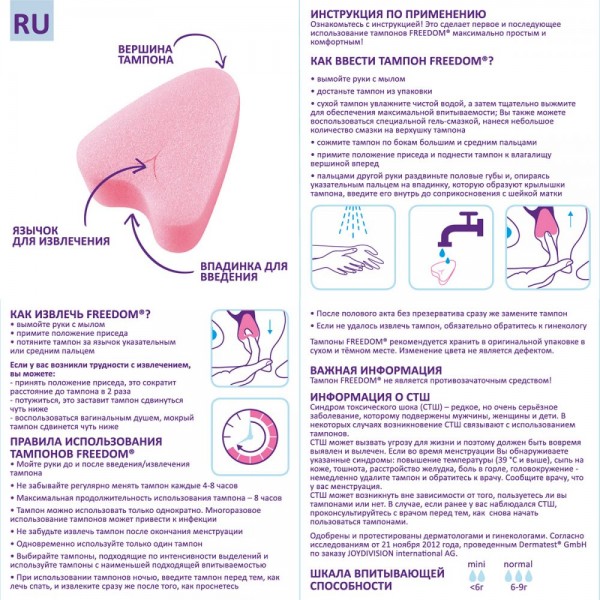 Комментарий: удобная форма в виде сердечка специальный воздушный материал легкость введения и извлечения легко адаптируется под форму тела, не ощущаются внутри, подходят для средних и обильных выделений, они обеспечивают не только надежную защиту от выделений в критические дни, но и дают возможность не отказываться от своих обычных увлечений и планов! Занимаюсь любовью, спортом, плаваю в бассейне, Подробная инструкция в упаковке!